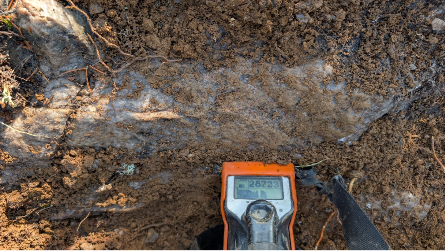 Figure 3. Newly discovered quartz-rich pegmatitic orthogneiss outcrop reaching upwards of 28,200 cps along the northern conductor trend. Outcrop was partially under soil cover.