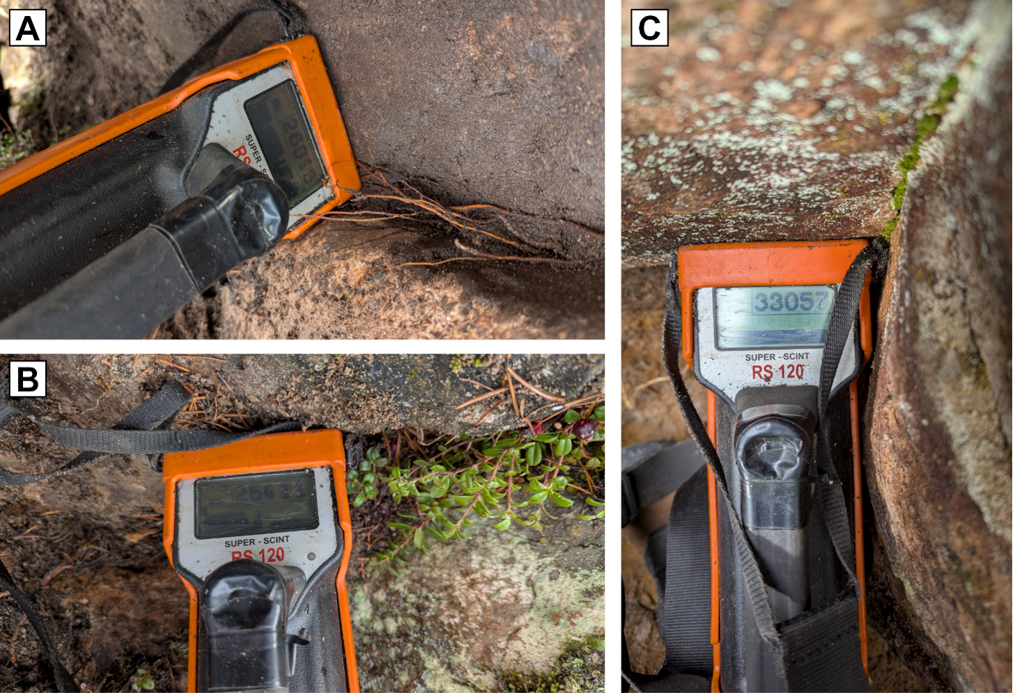 Figure 2. Investigation at SMDI showing 5781 returned strong radioactivity across an area of 35 m. Scintillometer readings ranging from: A) 26,900 cps, B) 25,400 cps, and C) 33,000 cps.