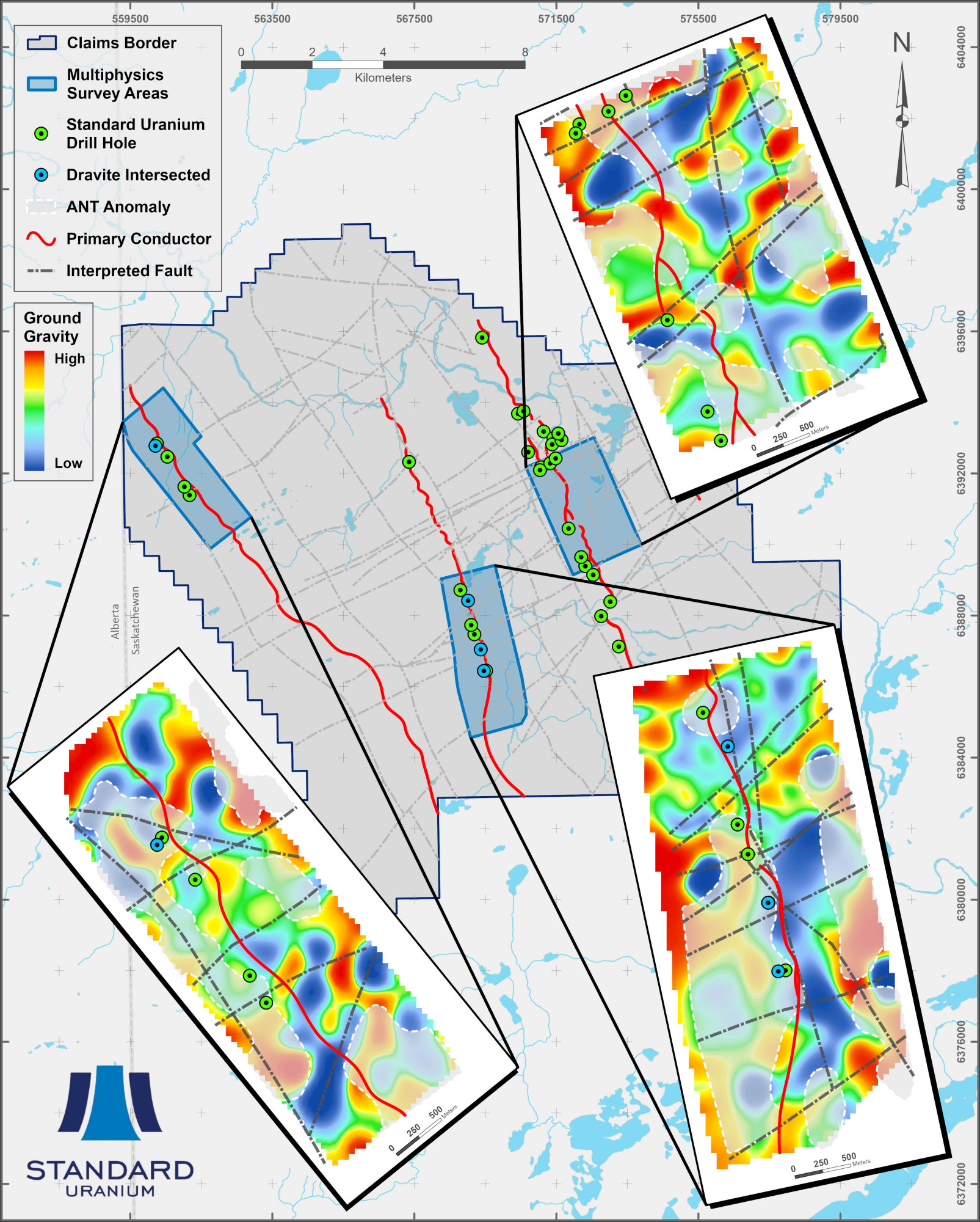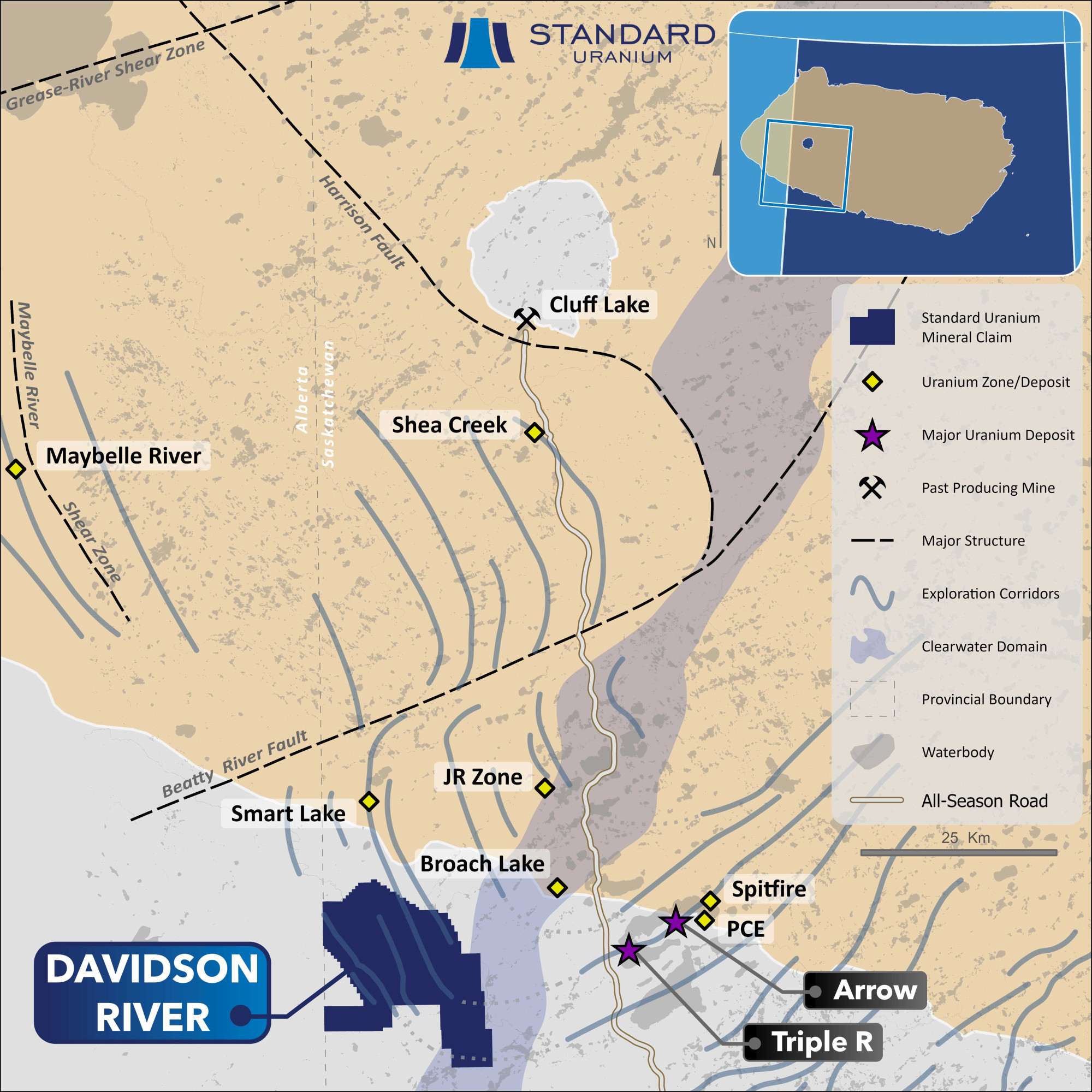 Davidson River is Standard Uranium’s flagship asset in the Southwest Athabasca Uranium District of northern Saskatchewan. The project covers the interpreted extension of the same prolific structural corridors that host two of the sector’s most significant discoveries - Paladin Energy’s Triple R deposit and NexGen Energy’s Arrow deposit - positioning Davidson River geologically along trend from more than 430 million pounds of known high-grade uranium. This district continues to yield new discoveries as modern geophysics, refined structural models, and exploration drilling systematically unlock additional high-grade zones, underscoring the ongoing potential for major resource growth.