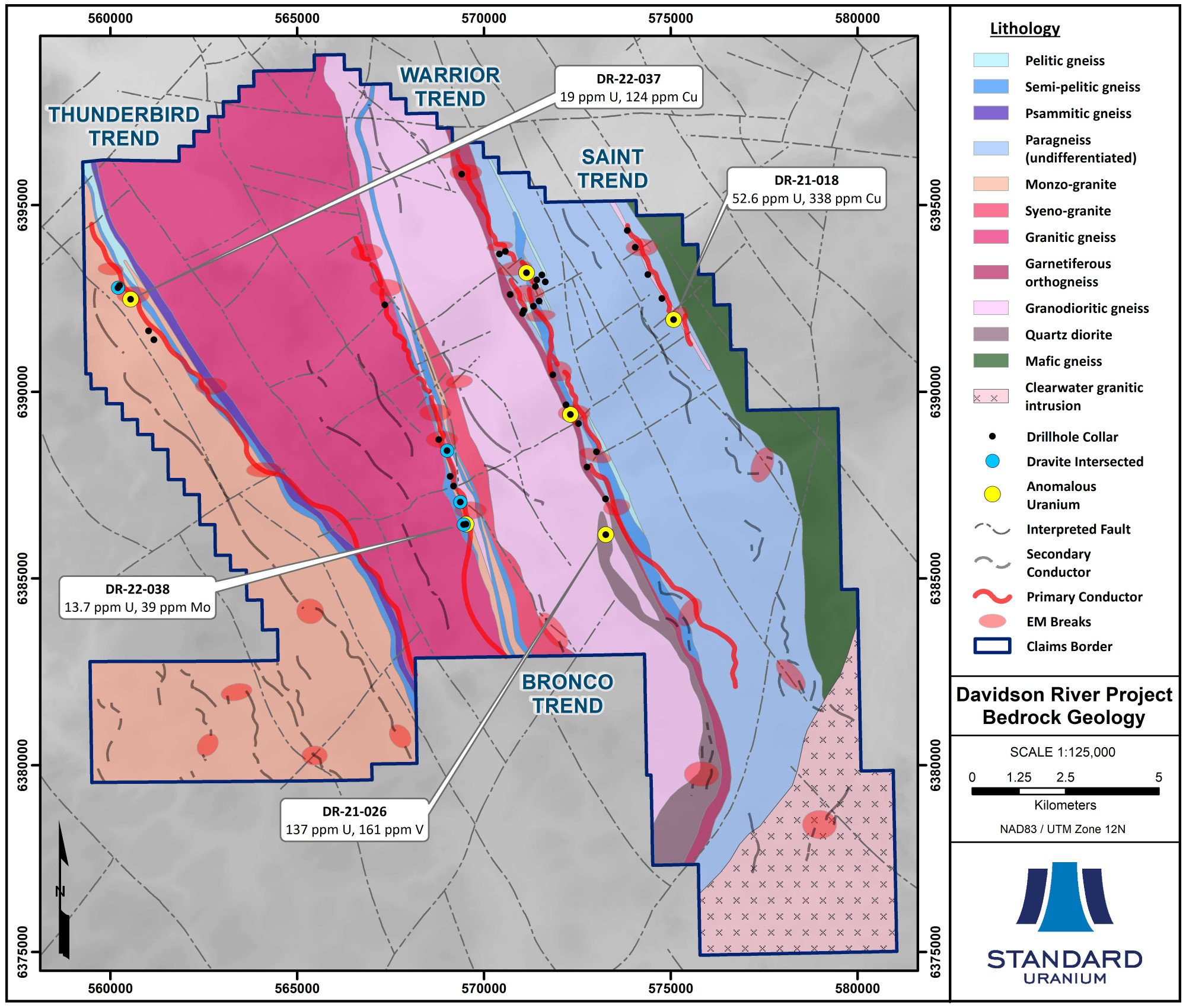 Davidson River comprises 10 contiguous mineral dispositions totaling 30,737 hectares and lies approximately 25 to 30 km west of the Arrow and Triple R uranium deposits and 75 km south of the past-producing Cluff Lake uranium mine. The Company has completed 16,561 metres of diamond drilling in 39 drill holes on the Davidson River property since 2020, which has further refined the exploration strategy for high-grade basement hosted uranium mineralization on the property. The flagship property hosts more than 70 km of conductive trends across four main structural corridors – the Warrior, Bronco, Thunderbird, and Saint trends (Figure 1). All four geophysical corridors contain multiple target areas favorable for high-grade basement hosted uranium mineralization.