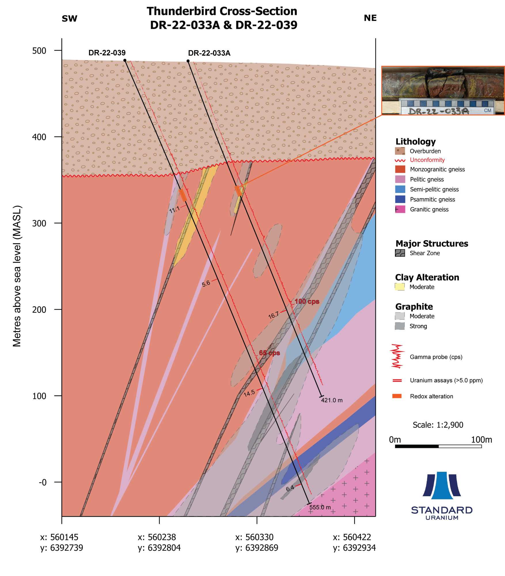 In 2018 and 2019, the Company conducted geophysical surveys that identified prospective signatures for uranium mineralization associated with the four main conductive corridors. These conductive trends are associated with graphitic-sulphidic structures in basement rocks, which are commonly associated with high-grade uranium mineralization systems. This concept has been proven for all four corridors, with several instances of graphitic-sulphidic fault rocks and reactivated structures intersected along the tested strike length.