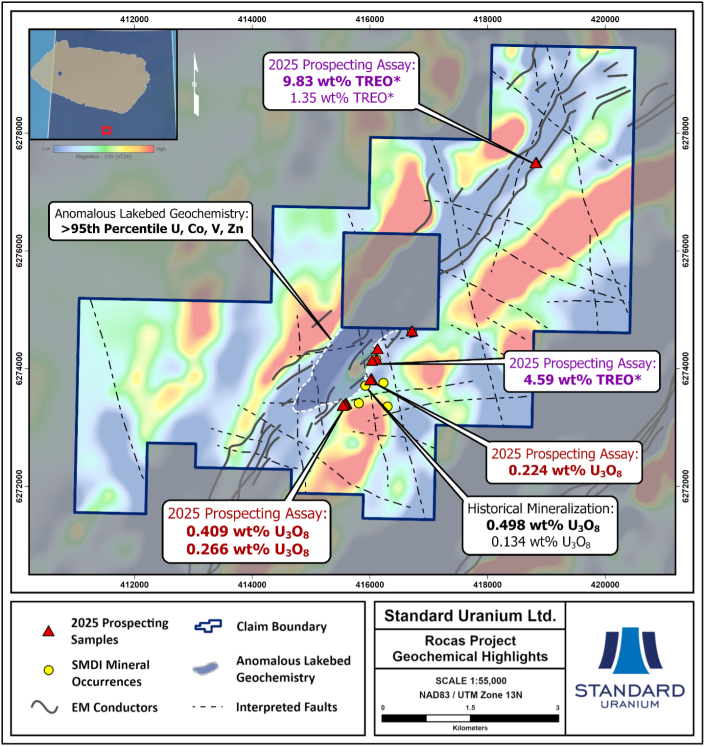 “The confirmation of high-grade Rare Earth Elements alongside uranium mineralization throughout the Rocas Project is a significant development that reveals substantial additional critical mineral value,” said Sean Hillacre, President & VP Exploration of Standard Uranium. “These assay results are highly encouraging, and we’ve integrated this data into our targeting models as we finalize preparations for the first-ever diamond drill program on the property.”