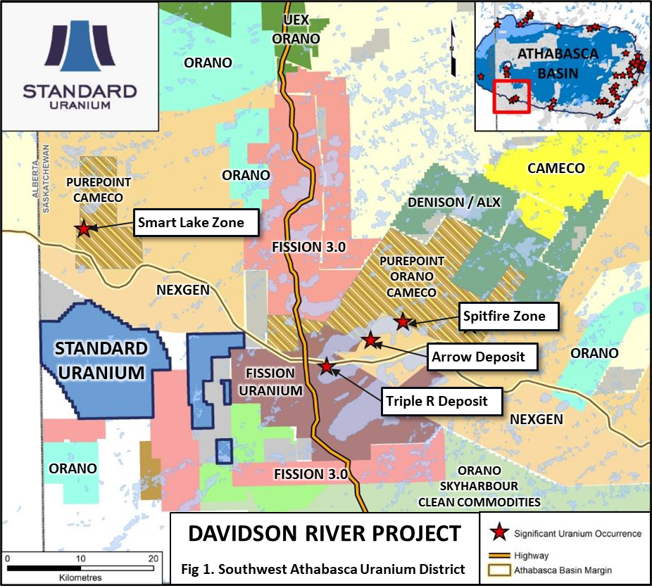 Standard Uranium is a mineral resource exploration company based in Vancouver, British Columbia. Since its establishment, Standard Uranium has focused on the identification and development of prospective exploration stage uranium projects in the Athabasca Basin in Saskatchewan, Canada. Standard Uranium’s Davidson River Project, in the southwest part of the Athabasca Basin, Saskatchewan, is comprised of 21 mineral claims over 25,886 hectares. The Davidson River Project is highly prospective for basement hosted uranium deposits yet remains untested by drilling despite its location along trend from recent high-grade uranium discoveries. A copy of the 43-101 Technical Report that summarizes the exploration on the Project is available for review under Standard Uranium’s SEDAR issuer profile (www.sedar.com).