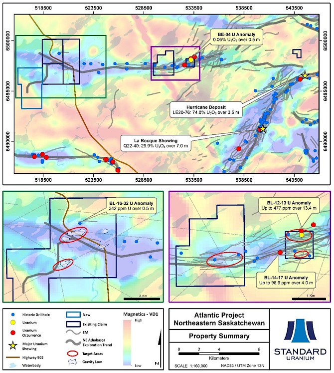 Figure 1. Summary of the Atlantic Project, highlighting geophysical target areas and historical uranium showings.