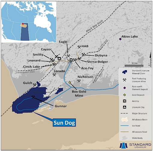 Standard Uranium's Sun Dog project, in the northwest part of the Athabasca Basin, Saskatchewan, is comprised of nine mineral claims over 19,603 hectares. The Sun Dog project is highly prospective for basement and unconformity hosted uranium deposits yet remains largely untested by sufficient drilling despite its location proximal to uranium discoveries in the area.