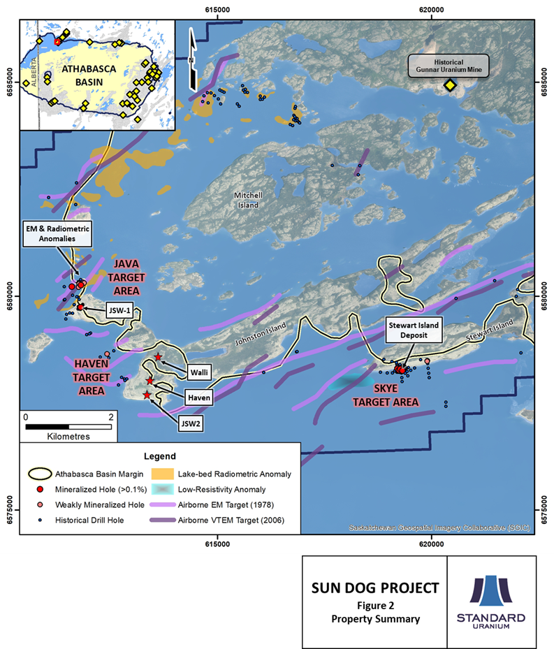 Vancouver, British Columbia, December 8, 2020 — Standard Uranium Ltd. (“Standard Uranium” or the “Company”) (TSX-V: STND) (Frankfurt: FWB:9SU) is pleased to announce high-grade analytical results from the fall, 2020 site visit at its 15,770 hectare, 100% owned, Sun Dog Project (the “Project”), previously known as the Gunnar Uranium Project. The three main target areas: Skye, Java and Haven have returned outcrop and boulder grab sample results with a high of 3.58% U308, 1.7% U308 and 0.7% U308, respectively.