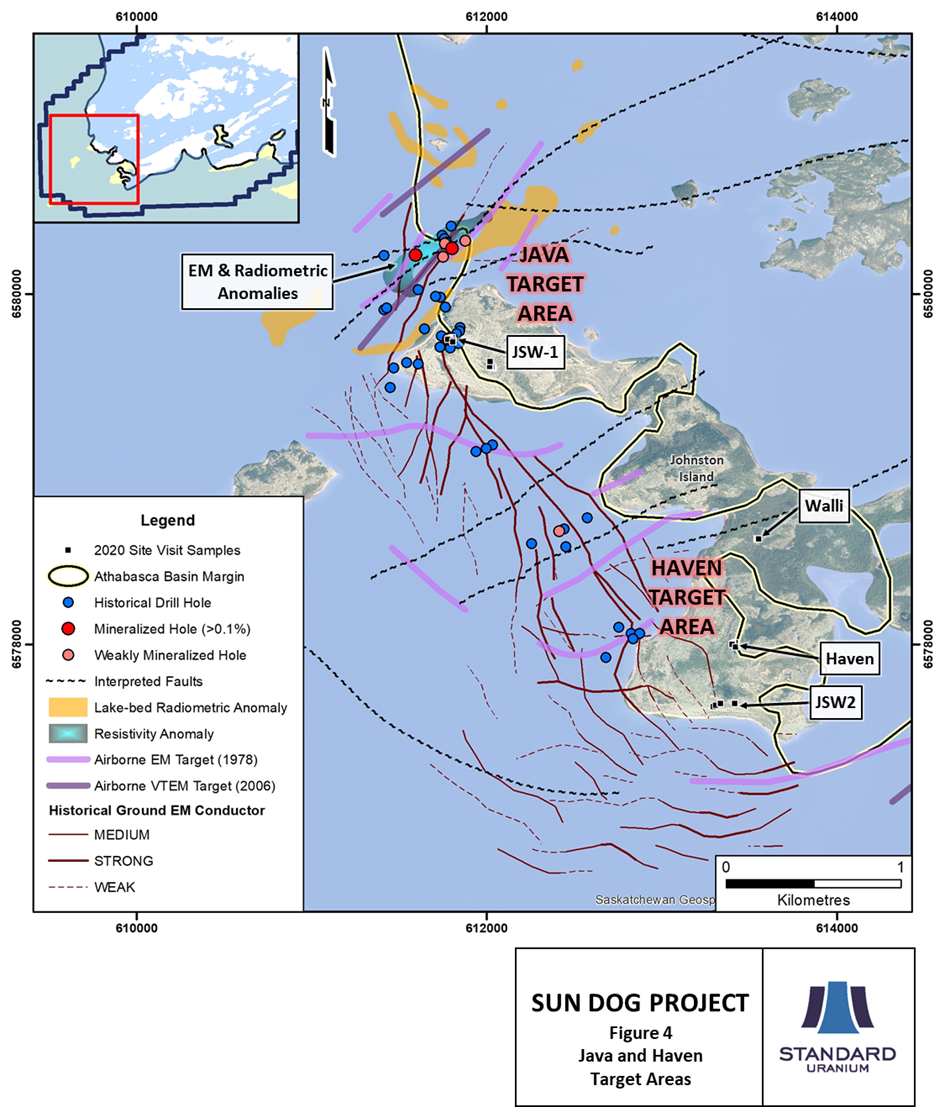 The Java Target at the north-west end of Johnston Island encompasses the historical JSW-1 prospect and the unconformity-related uranium target to the north (Figure 1). The JSW-1 prospect was channel sampled in 1977 by SMDC with results of 0.43% U3O8 over 4.2 m at surface. Individual grab samples were as high as 12.4% U3O8.