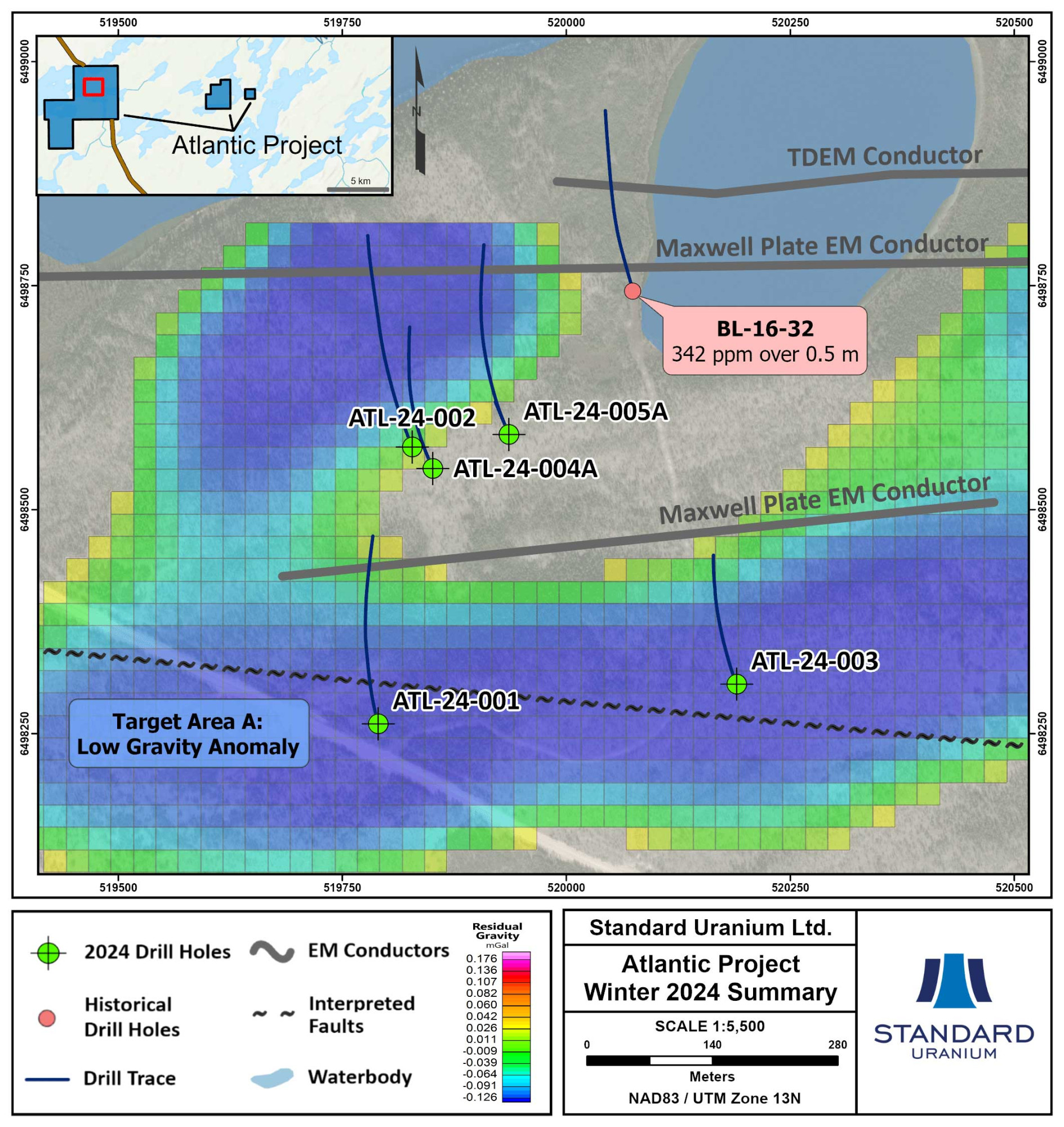 The Company’s maiden winter 2024 drill program comprised 3,316 m of diamond drilling across 5 drill holes on the western claim block. Inaugural drilling intersected the key characteristics of a uranium-bearing mineralized system in previously untested “Target Area A”, confirming the presence of a significant graphitic fault system in the basement rock linked to uranium mineralization and prospective hydrothermal alteration at the unconformity and in the basement rock. The drill program was designed to follow up on highly anomalous uranium results returned from drill hole BL-16-32, in addition to testing the newly outlined gravity lows defined by the 2022 ground survey. On the western Atlantic claim block, drilling by Denison Mines in 2016 (Hole BL-16-32) identified 342 ppm uranium over 0.5 m at the base of the sandstone, just north of Target Area A. Winter drilling was focused in Target Area A which is defined by a 1,400-metre x 850-metre density-low anomaly coinciding with stacked electromagnetic (“EM”) conductors and an interpreted regional fault. Figure 1 highlights winter 2024 drilling focused on testing the 3D density anomaly target at the unconformity linked to basement EM conductors and interpreted fault trends.