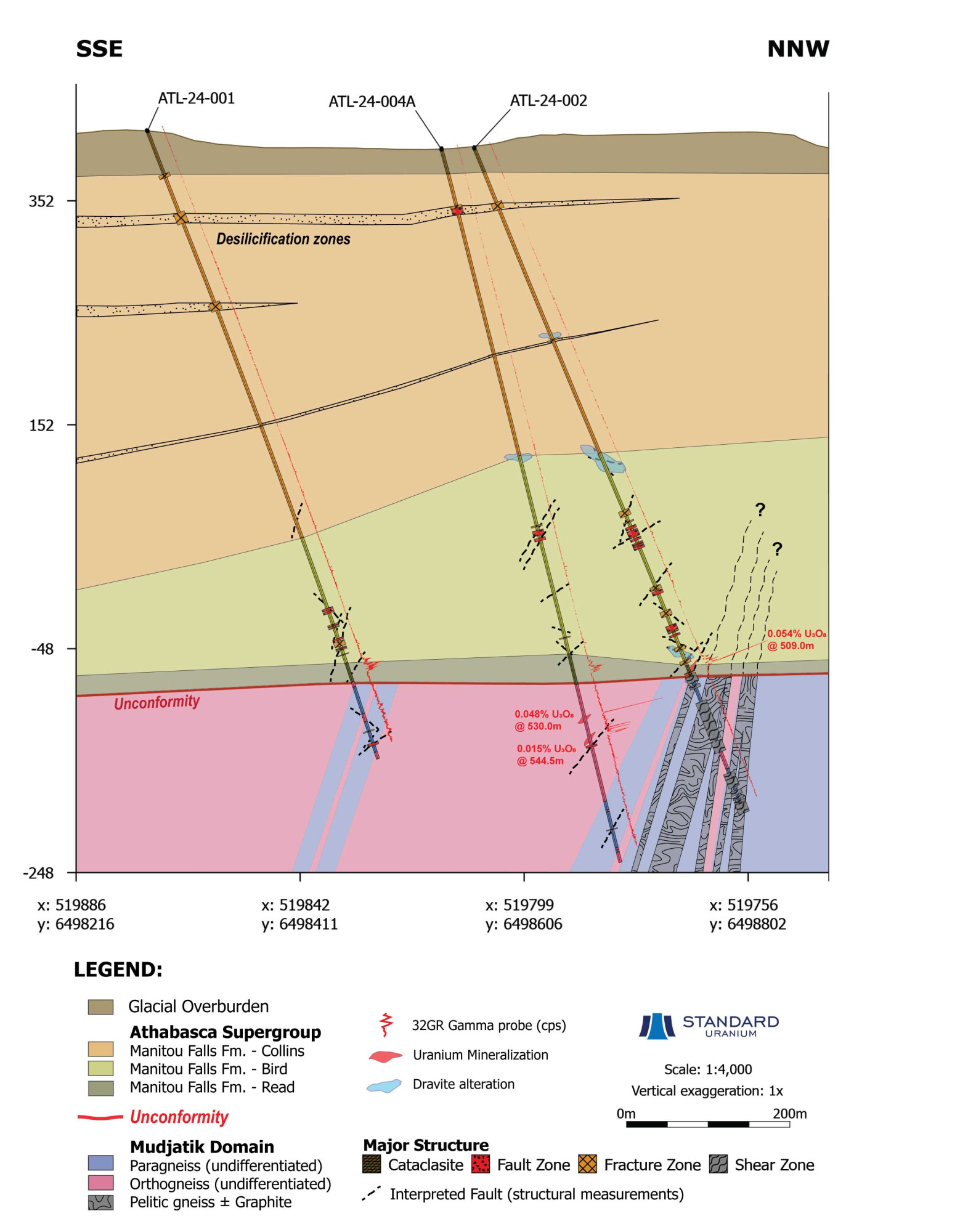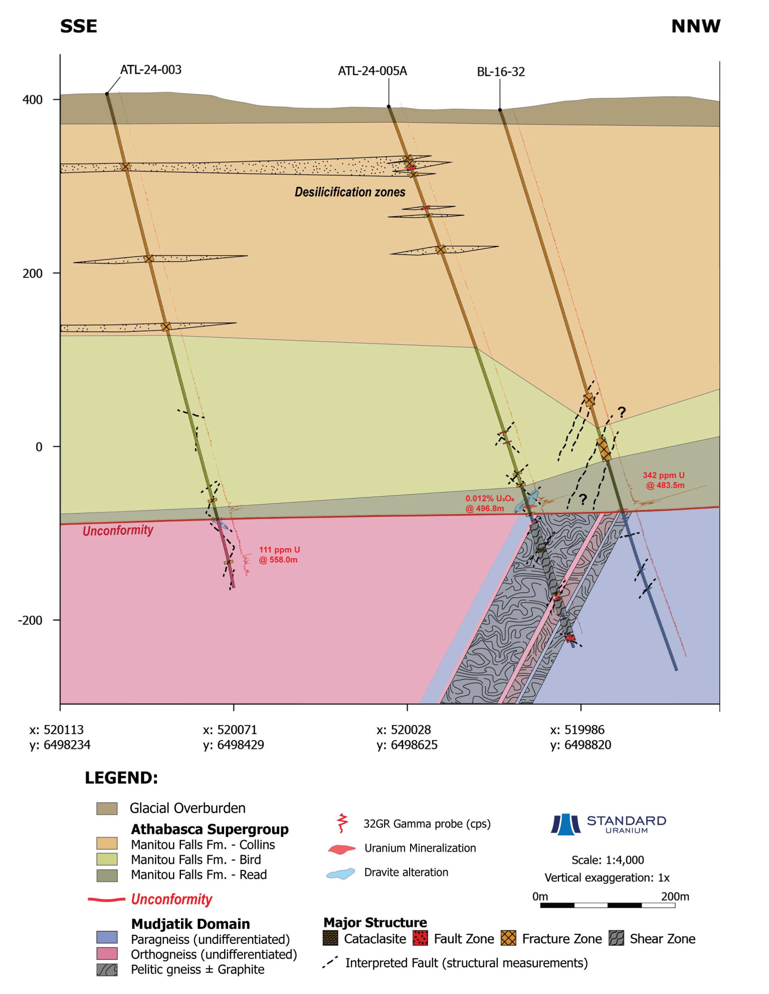 Historical drilling by Cameco in 1992 (Hole BE-04) encountered up to 0.06% U3O8 over 0.5 m in the sandstone, proximal to the unconformity. Additionally, the hole encountered elevated uranium and nickel, as well as illite and chlorite alteration in the lower 10 m of sandstone.