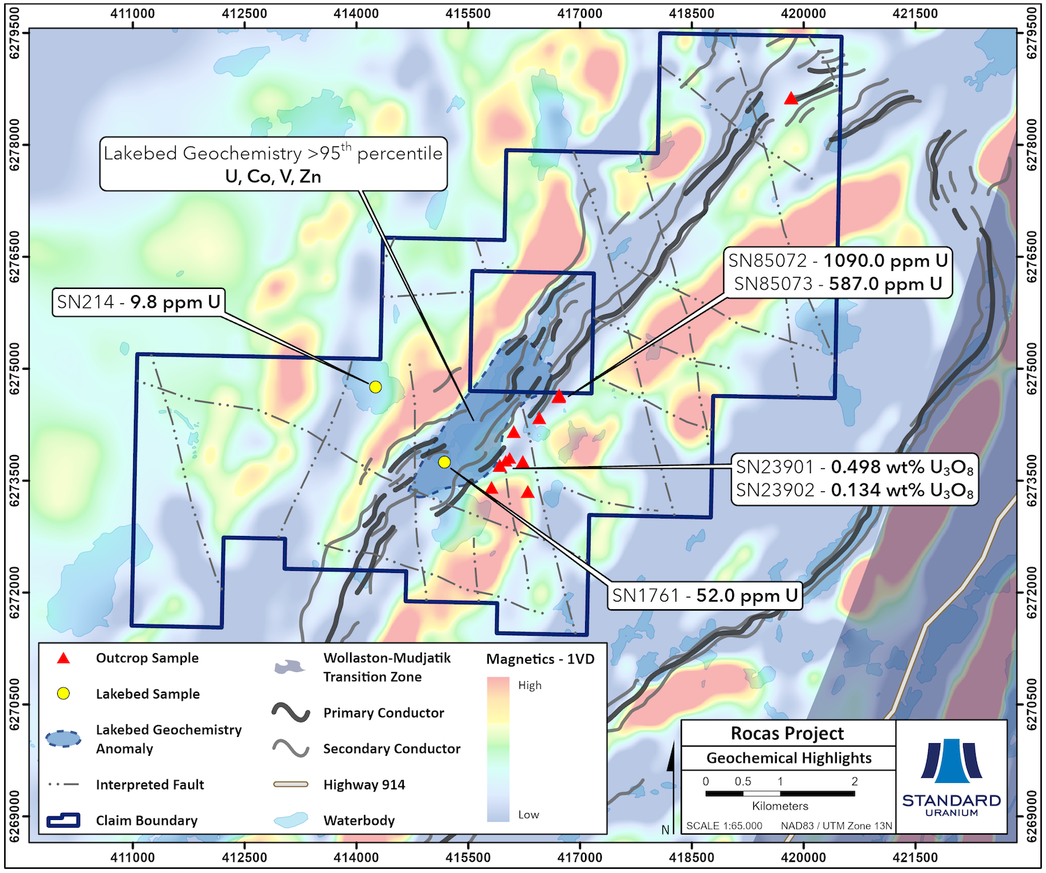 Historical airborne EM work in 2017 defined conductive trends on the Project west of and sub-parallel to the Key Lake Road shear zone, corresponding with favourable metasedimentary basement lithologies. Multiple parallel conductors, offsets, and termination points indicate the trend widening and potential cross-cutting structures. Additionally, a 2007 field sampling program identified anomalous lakebed geochemical anomalies that statistically rank as greater than 95th percentile U, Co, V, and Zn along the conductor corridor, including high U/Th ratios.